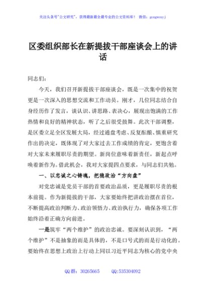 / 区委组织部长在新提拔干部座谈会上的讲话