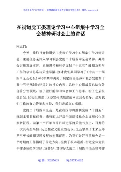 / 在街道党工委理论学习中心组集中学习全会精神研讨会上的讲话