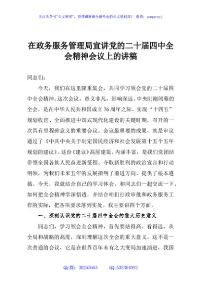 / 在政务服务管理局宣讲党的二十届四中全会精神会议上的讲稿