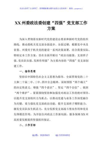 / XX州委政法委创建“四强”党支部工作方案