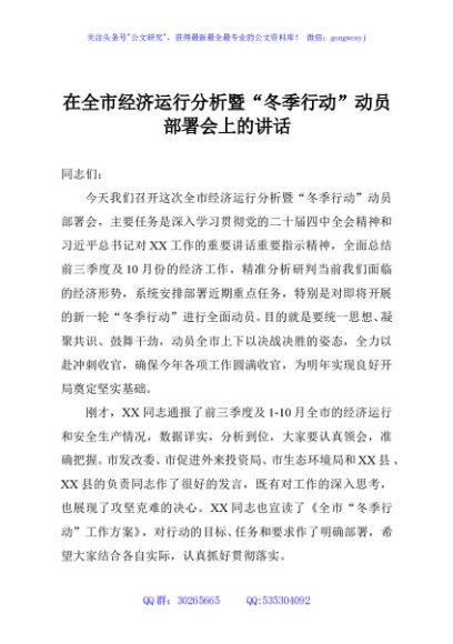 / 在全市经济运行分析暨“冬季行动”动员部署会上的讲话