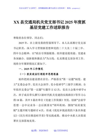 / XX县交通局机关党支部书记2025年度抓基层党建工作述职报告