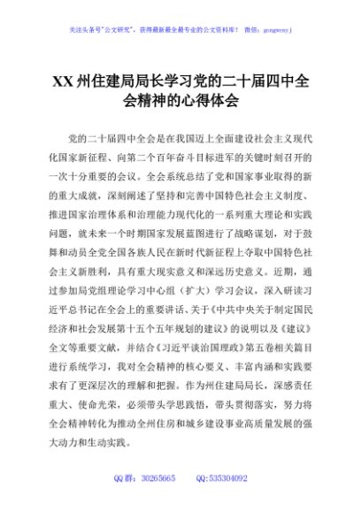 / XX州住建局局长学习党的二十届四中全会精神的心得体会