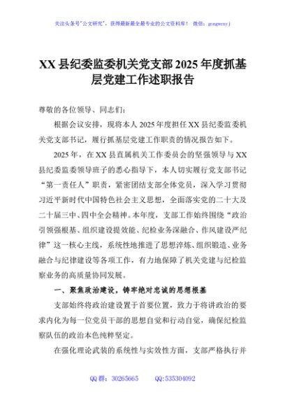 / XX县纪委监委机关党支部2025年度抓基层党建工作述职报告