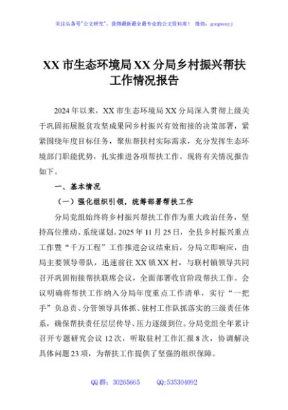 / XX市生态环境局XX分局乡村振兴帮扶工作情况报告