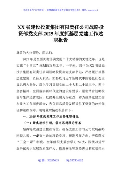 / XX省建设投资集团有限责任公司战略投资部党支部2025年度抓基层党建工作述职报告