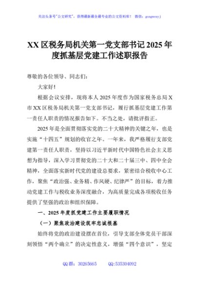 / XX区税务局机关第一党支部书记2025年度抓基层党建工作述职报告