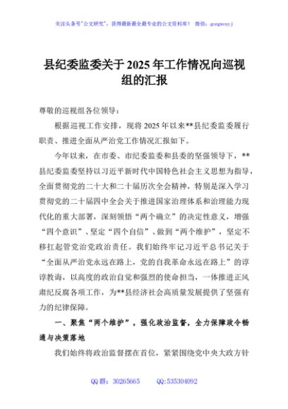 / 县纪委监委关于2025年工作情况向巡视组的汇报