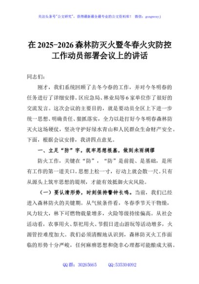 / 在2025-2026森林防灭火暨冬春火灾防控工作动员部署会议上的讲话