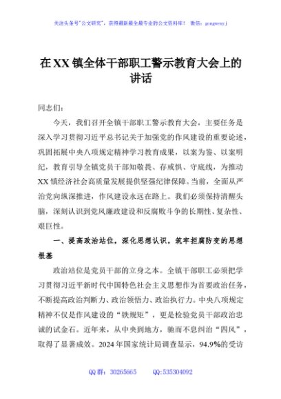 / 在XX镇全体干部职工警示教育大会上的讲话