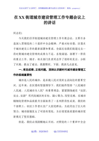/ 在XX街道城市建设管理工作专题会议上的讲话