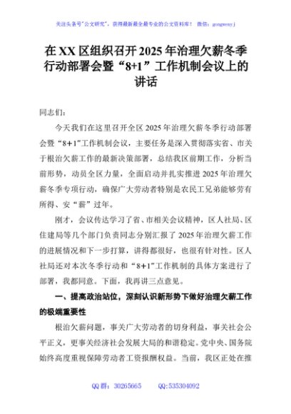 / 在XX区组织召开2025年治理欠薪冬季行动部署会暨“8+1”工作机制会议上的讲话