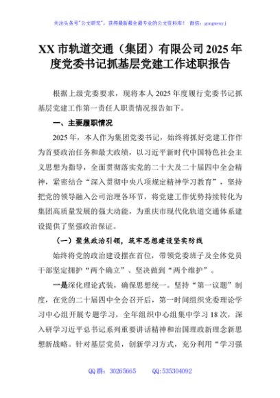 / XX市轨道交通(集团)有限公司2025年度党委书记抓基层党建工作述职报告