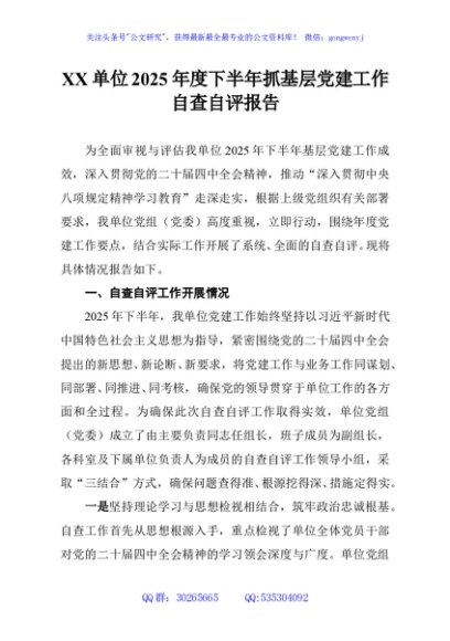/ XX单位2025年度下半年抓基层党建工作自查自评报告