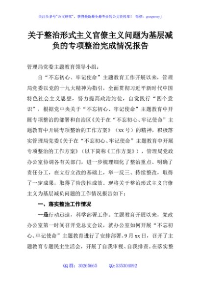 / 关于整治形式主义官僚主义问题为基层减负的专项整治完成情况报告