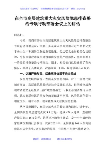 / 在全市高层建筑重大火灾风险隐患排查整治专项行动部署会议上的讲话
