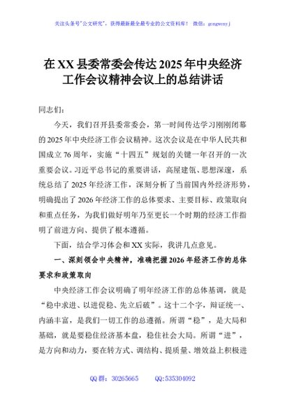 / 在XX县委常委会传达2025年中央经济工作会议精神会议上的总结讲话