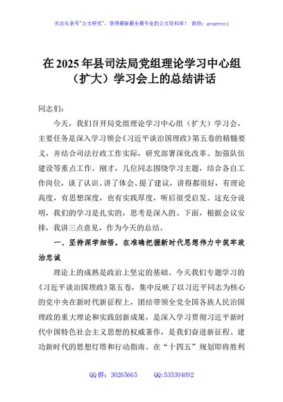 / 在2025年县司法局党组理论学习中心组(扩大)学习会上的总结讲话