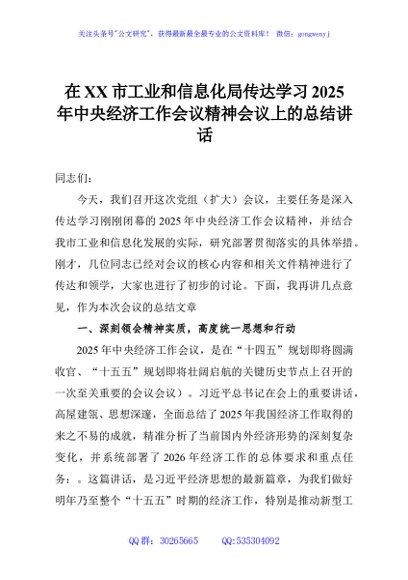 / 在XX市工业和信息化局传达学习2025年中央经济工作会议精神会议上的总结讲话