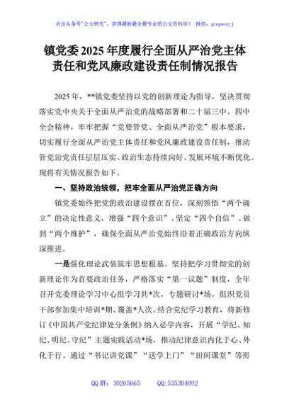 / 镇党委2025年度履行全面从严治党主体责任和党风廉政建设责任制情况报告