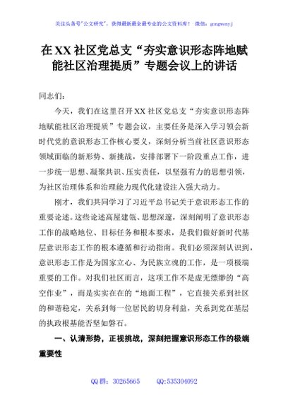 / 在XX社区党总支“夯实意识形态阵地赋能社区治理提质”专题会议上的讲话