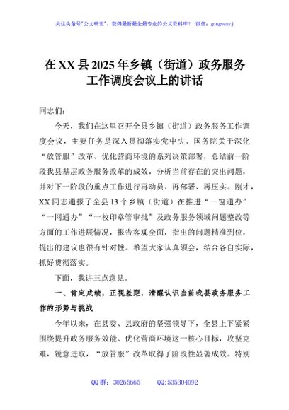 / 在XX县2025年乡镇(街道)政务服务工作调度会议上的讲话