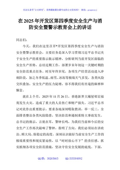 / 在2025年开发区第四季度安全生产与消防安全暨警示教育会上的讲话