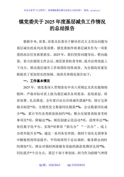 / 镇党委关于2025年度基层减负工作情况的总结报告