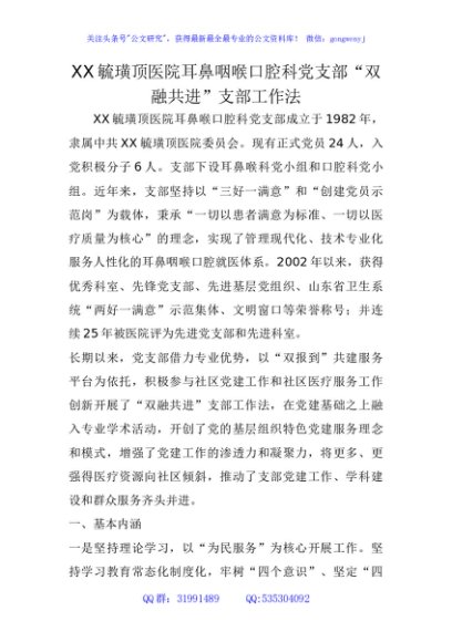/ 医院耳鼻咽喉口腔科党支部“双融共进”支部工作法(党建品牌)
