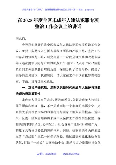 / 在2025年度全区未成年人违法犯罪专项整治工作会议上的讲话