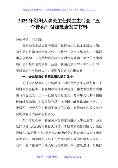 / 2025年组织人事处主任民主生活会“五个带头”对照检查发言材料