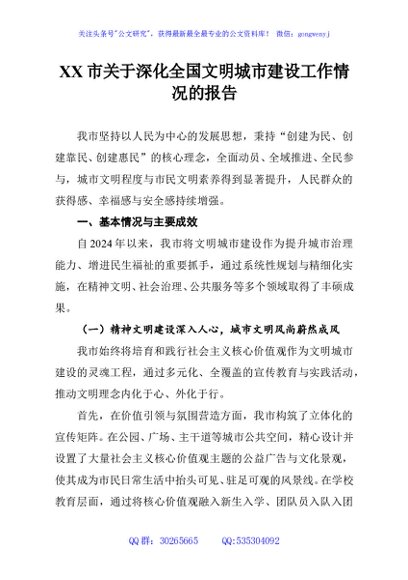 / XX市关于深化全国文明城市建设工作情况的报告