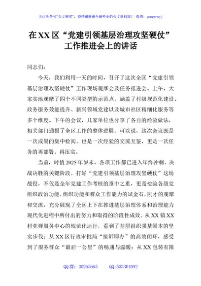 / 在XX区“党建引领基层治理攻坚硬仗”工作推进会上的讲话