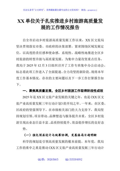 / XX单位关于扎实推进乡村旅游高质量发展的工作情况报告
