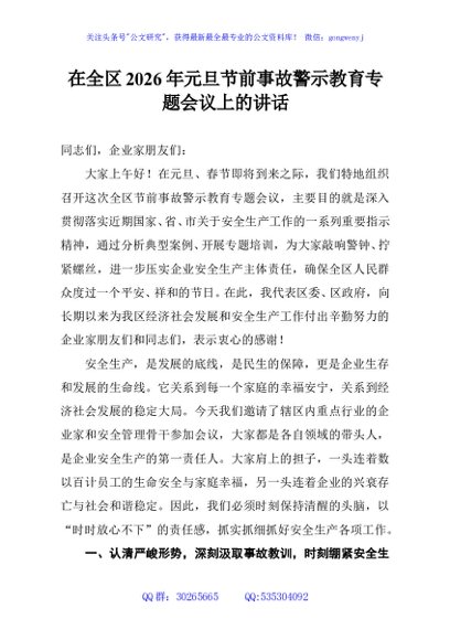 / 在全区2026年元旦节前事故警示教育专题会议上的讲话