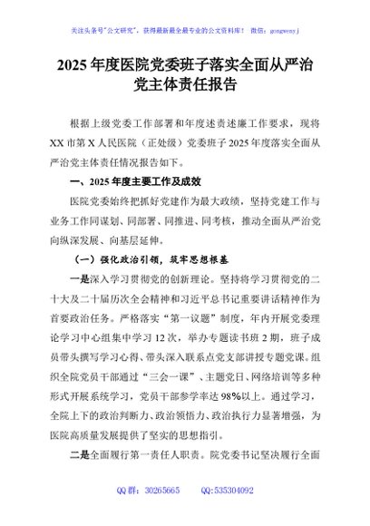 / 2025年度医院党委班子落实全面从严治党主体责任报告