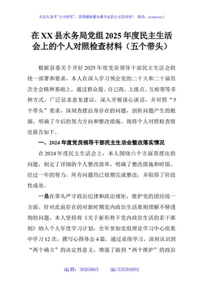 / 在XX县水务局党组2025年度民主生活会上的个人对照检查材料(五个带头)