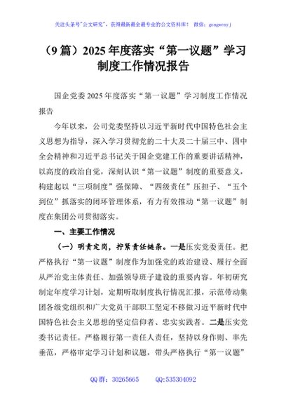 / (9篇)2025年度落实“第一议题”学习制度工作情况报告