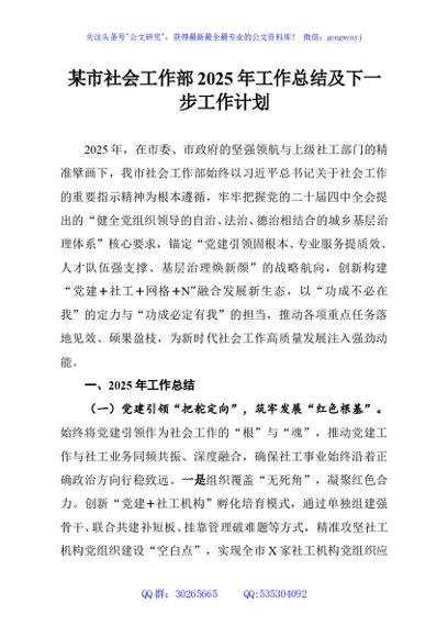 / 某市社会工作部2025年工作总结及下一步工作计划