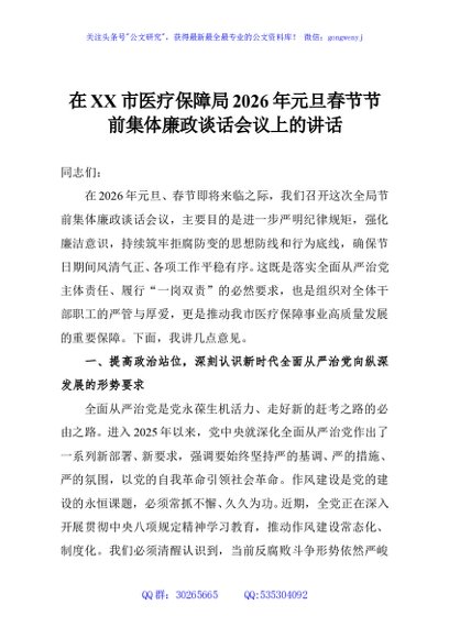 / 在XX市医疗保障局2026年元旦春节节前集体廉政谈话会议上的讲话