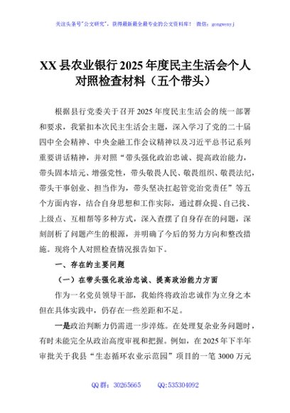 / XX县农业银行2025年度民主生活会个人对照检查材料(五个带头)