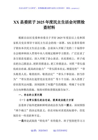 / XX县委班子2025年度民主生活会对照检查材料