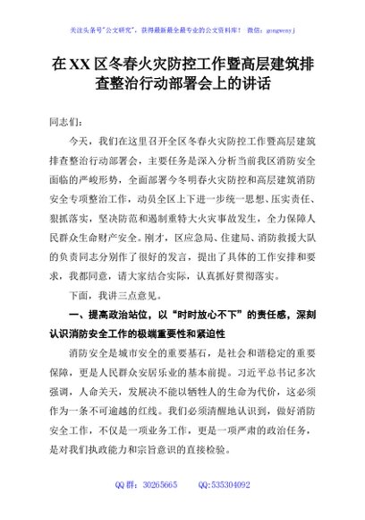 / 在XX区冬春火灾防控工作暨高层建筑排查整治行动部署会上的讲话