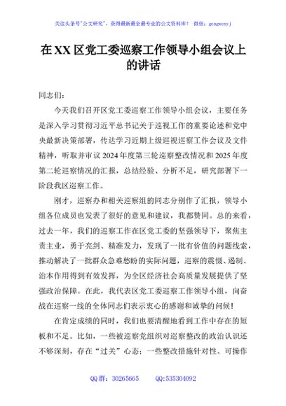 / 在XX区党工委巡察工作领导小组会议上的讲话