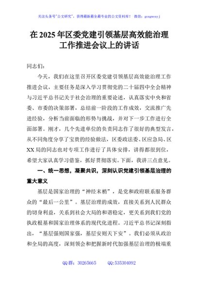 / 在2025年区委党建引领基层高效能治理工作推进会议上的讲话