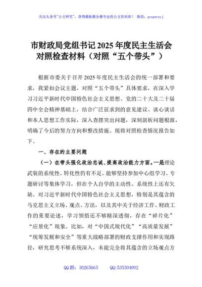 / 市财政局党组书记2025年度民主生活会对照检查材料(对照“五个带头”)