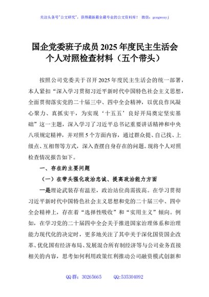 / 国企党委班子成员2025年度民主生活会个人对照检查材料(五个带头)