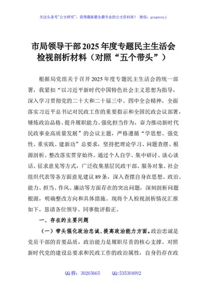 / 市局领导干部2025年度专题民主生活会检视剖析材料(对照“五个带头”)