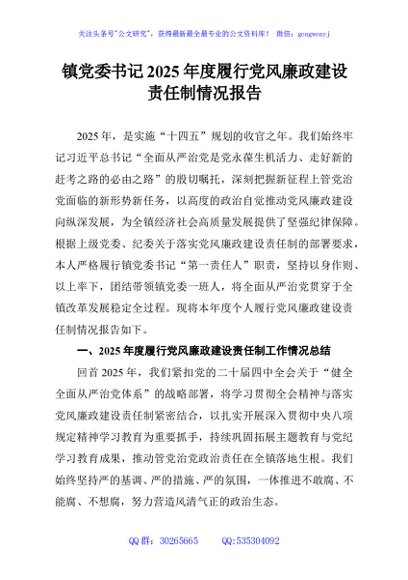 / 镇党委书记2025年度履行党风廉政建设责任制情况报告