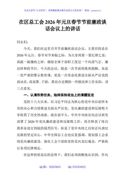 / 在区总工会2026年元旦春节节前廉政谈话会议上的讲话